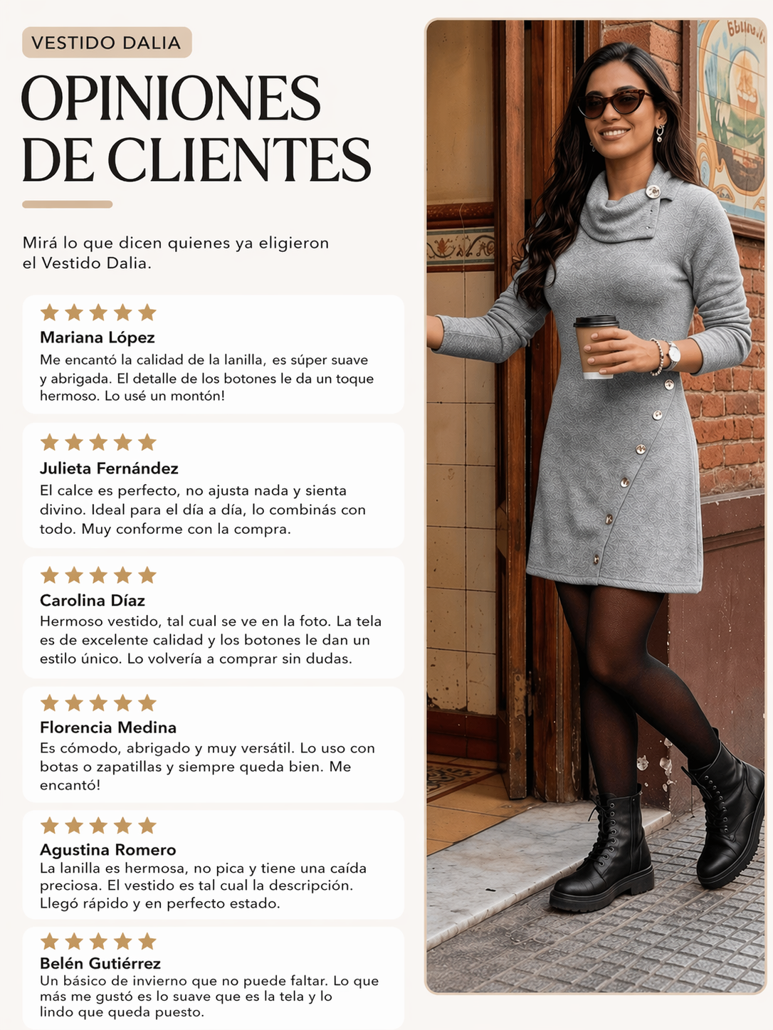 Vestido Dalia: confeccionado en lanilla, suave y abrigado, con detalle de botones que suma un toque moderno y canchero. Ideal para looks de invierno cómodos y con estilo.